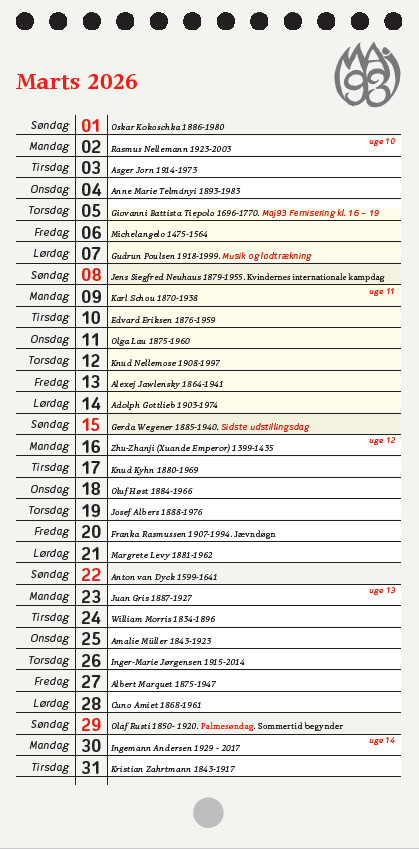 | Maj 93 udgiver hvert år en særlig kalender, illustreret med værker fra årets udstilling. Kalenderen er en kunsthistorisk specialitet, hvor der ud for hver dato står navnet på en kunstner, der var født den pågældende dag. En anden særlig ting ved vores kalender er, at der er 13 måneder - vi skal jo også have plads til næste års udstilling i januar. Kalenderen sendes til medlemmerne af Maj 93’s venner. Den kan også købes på udstillingen eller, så længe lager haves, ved at sende 50.- kr. + porto til gruppens konto nr. 2276 0166182913 med angivelse af navn og adresse. | ![]() Marts måned i 2026-kalenderen |
